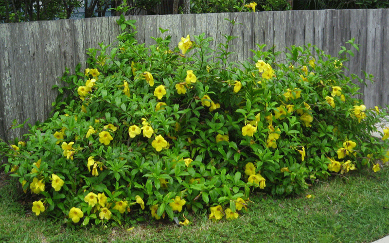 These plants tend to become bare at the base when they're more mature. If you dislike that look, grow small plants around the Allamanda to cover up the trunk. You can keep them trimmed at 3 feet while young and then 4 or 5 feet tall once they're mature.