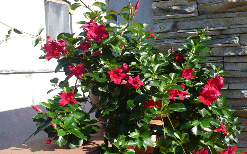 Dipladenia Rio Deep Red plants have a compact, well-branched habit with minimum vineing so there is no need to stake or trellis them. The 3-inch, trumpet-shaped flowers are produced all summer.