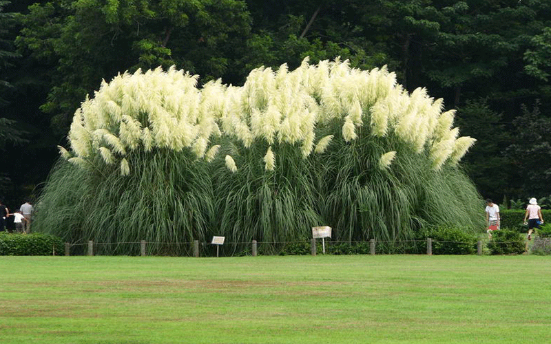 Most people are familiar with the large clumps of lush, grass-like foliage and creamy white feathery plumes of pampas grass. The plumes are white and very showy. The leaves have sharp edges that can slice your skin like a bad paper cut, so plant away from walks, drives and play areas. When handling, wear protective clothing.