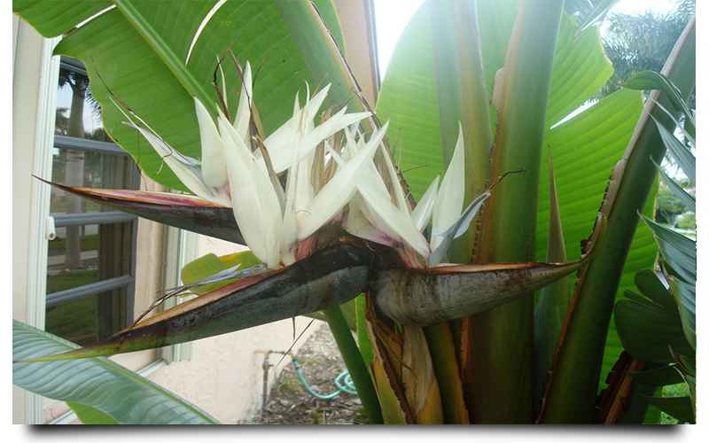 A white bird of paradise can be a real showpiece in a landscape. It can be used to accent tall pillars near a home's entrance, add a tropical note as a backdrop in a mixed bed, or as a striking container plant on the patio or pool deck.