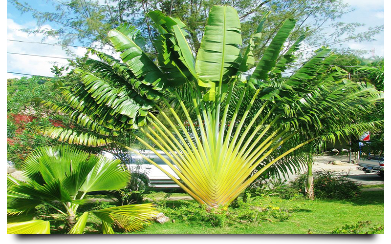 The fan-like Traveler’s Palm, is not a palm tree at all. Native to Madagascar, this plant is a close relative of the banana plant and belongs to the same family as the Bird of Paradise. Its name comes from the leaf base formation, a cupped shape that holds water that thirsty travelers could drink.
